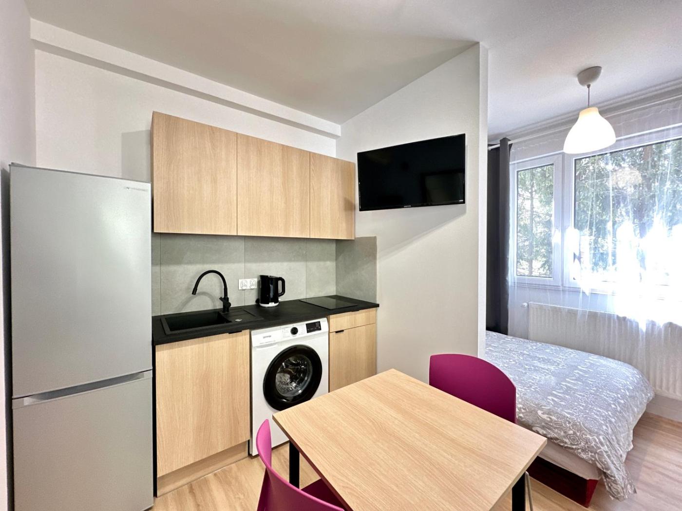 Studio. The studio provides a washing machine and a dining area, as well as a private bathroom featuring a shower. The well-fitted kitchenette features a stovetop, a refrigerator, kitchenware and an electric kettle. This studio has parquet floors, heating and a flat-screen TV. The unit offers 2 beds. Studio - 4 osobowy. Powierzchnia pokoju ok.: 23 mkw.
