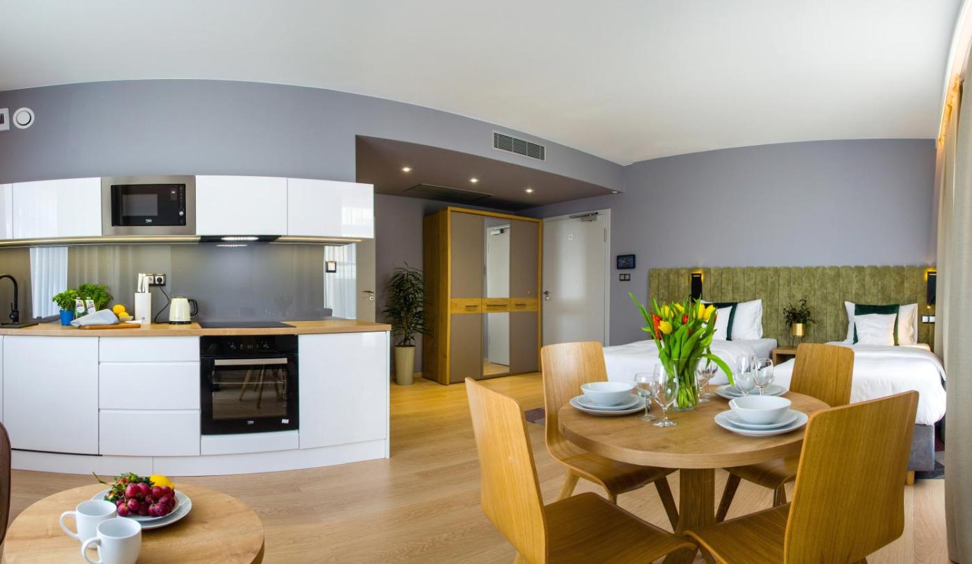 Apartament typu Standard. The air-conditioned apartment features 1 bedroom and 1 bathroom with a shower and a hairdryer. Guests can make meals in the kitchenette that is fitted with a stovetop, a refrigerator, kitchenware and an oven. The apartment offers soundproof walls, a tea and coffee maker, a wardrobe, parquet floors, as well as a flat-screen TV with cable channels. The unit offers 1 bed. Apartament - 2 osobowy. Powierzchnia pokoju ok.: 23 mkw. ;