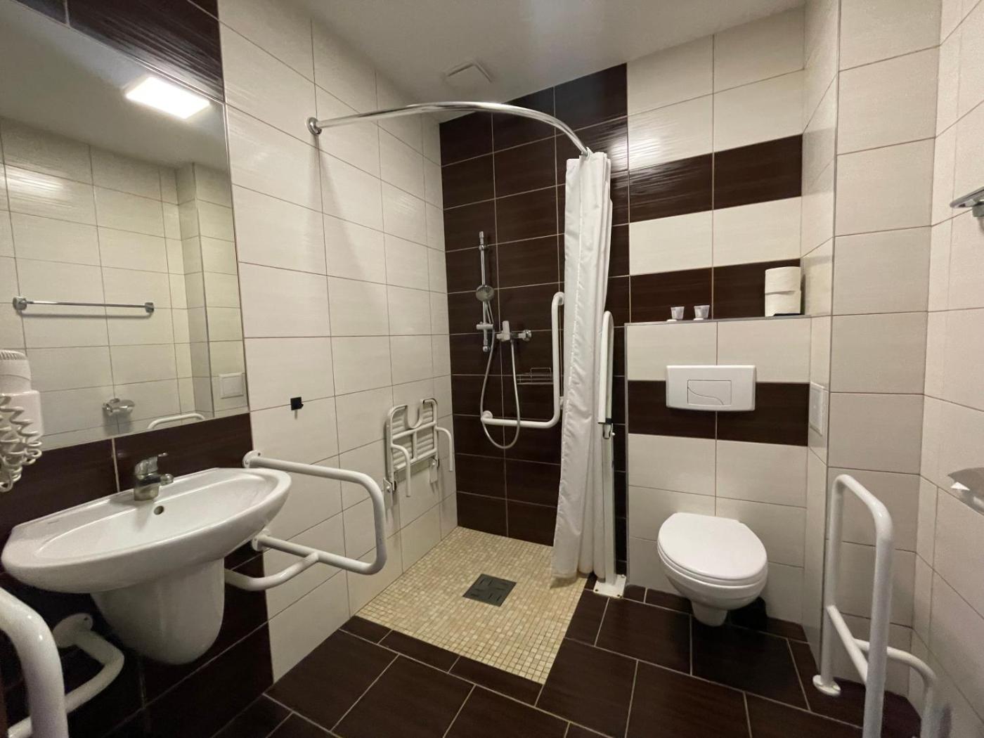 Pokój Dwuosobowy przystosowany dla osób niepełnosprawnych. Ten pokój dwuosobowy obejmuje prywatną łazienkę z prysznicem typu walk-in, suszarką do włosów i bezpłatnymi przyborami toaletowymi. Pokój dwuosobowy ma dźwiękoszczelne ściany i podłogę wyłożoną wykładziną. Wyposażenie obejmuje szafę, telewizor z płaskim ekranem oraz zestaw do parzenia kawy i herbaty. W tej opcji zakwaterowania dostępne są 2 łóżka. Pokój Dwuosobowy - 2 osobowy. Powierzchnia pokoju ok.: 16 mkw. ;