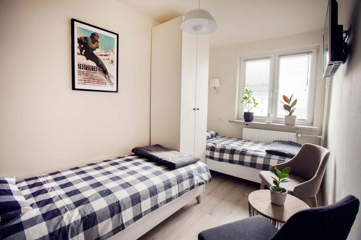 Apartament ze wspólną łazienką. The apartment provides a wardrobe, heating, as well as a shared bathroom featuring a shower. The apartment offers soundproof walls, a tea and coffee maker, a dining area, a flat-screen TV with streaming services, as well as city views. The unit offers 2 beds. Apartament - 2 osobowy. Powierzchnia pokoju ok.: 9 mkw.